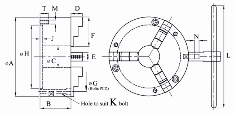 Big Bore Self Centering chucks are mainly used for pipe work or where less gripping force is required so that the job is not damaged. Mounting Bolts, Operating Key and Inspection Report is provided with each chuck.